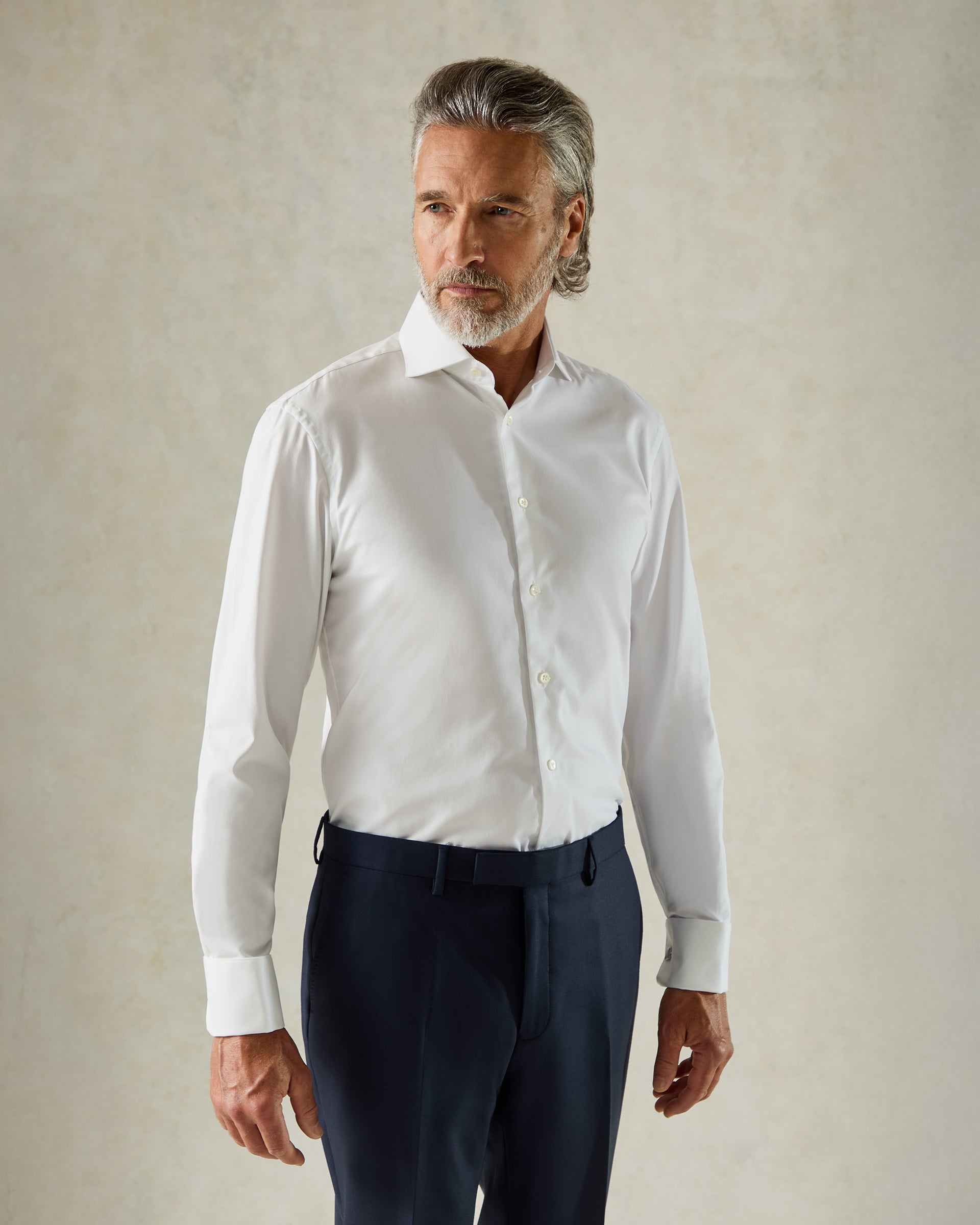 The Torlese Suit in Grey Sharkskin by Gieves & Hawkes is a masterclass in refined British tailoring that is presented as a three piece ensemble. The jacket features a single-breasted design with a peak lapel and single vent, fully lined for a smooth, comfortable fit. Complementing the jacket, the trousers are styled with a flat front, side adjusters, and a dinner split, while the vest completes the ensemble. Crafted from luxurious Italian Angelico fabric with a subtle sharkskin sheen, this suit combines traditional elegance with modern flair, making it ideal for both formal occasions and business settings.