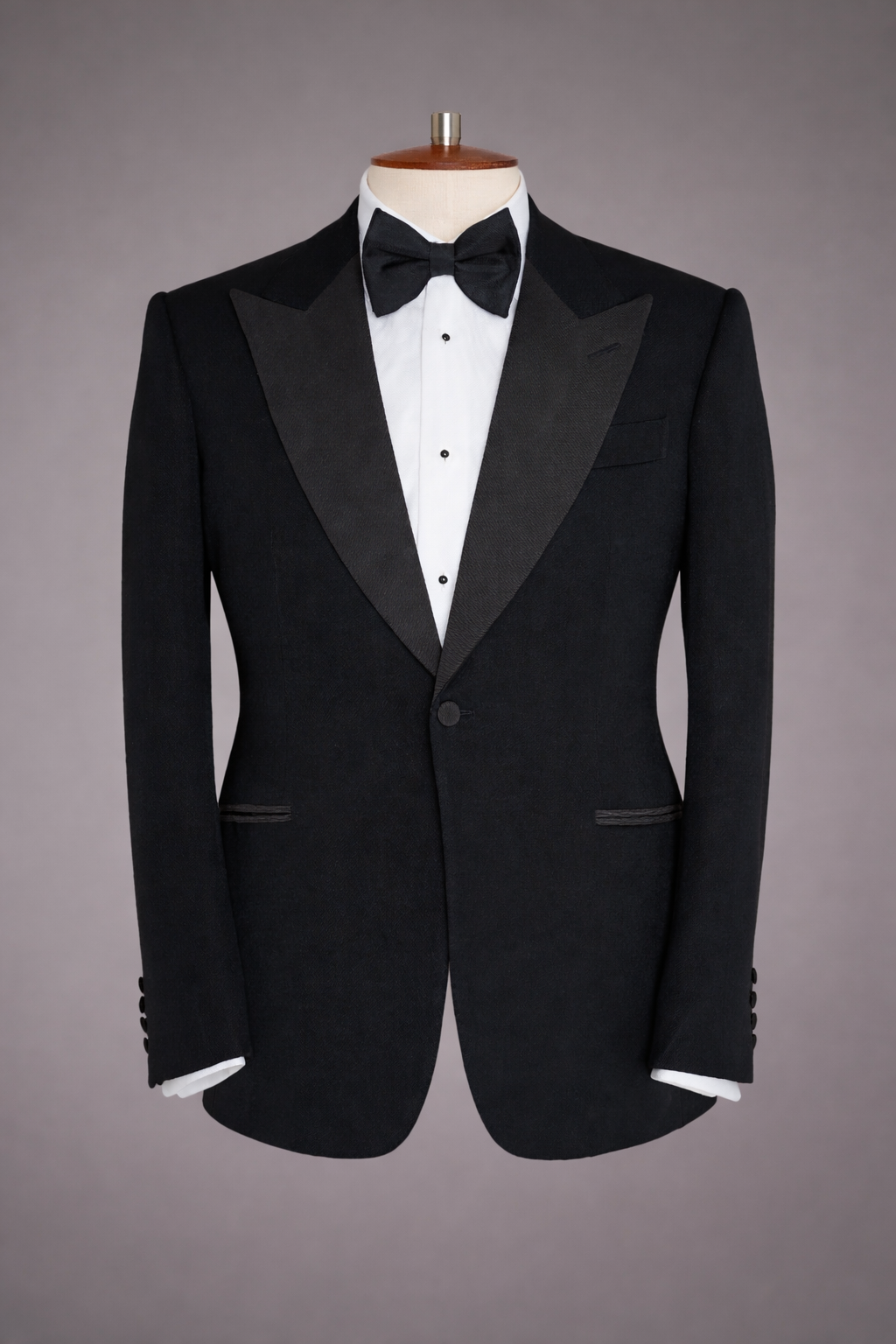 Men's single breasted black barathea dinner suit, Peak Lapels, Jetted pockets and buttons finished in black corded silk.